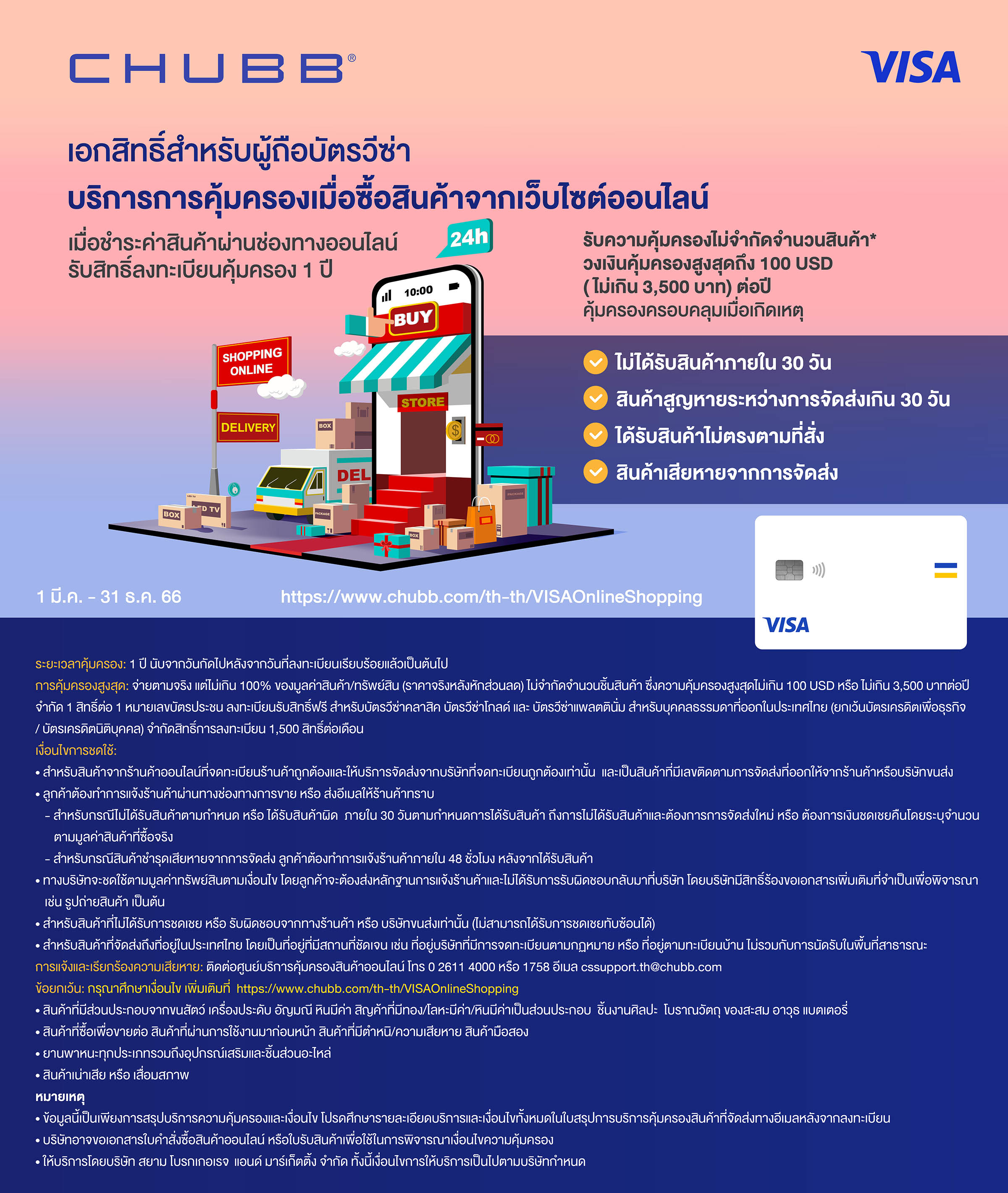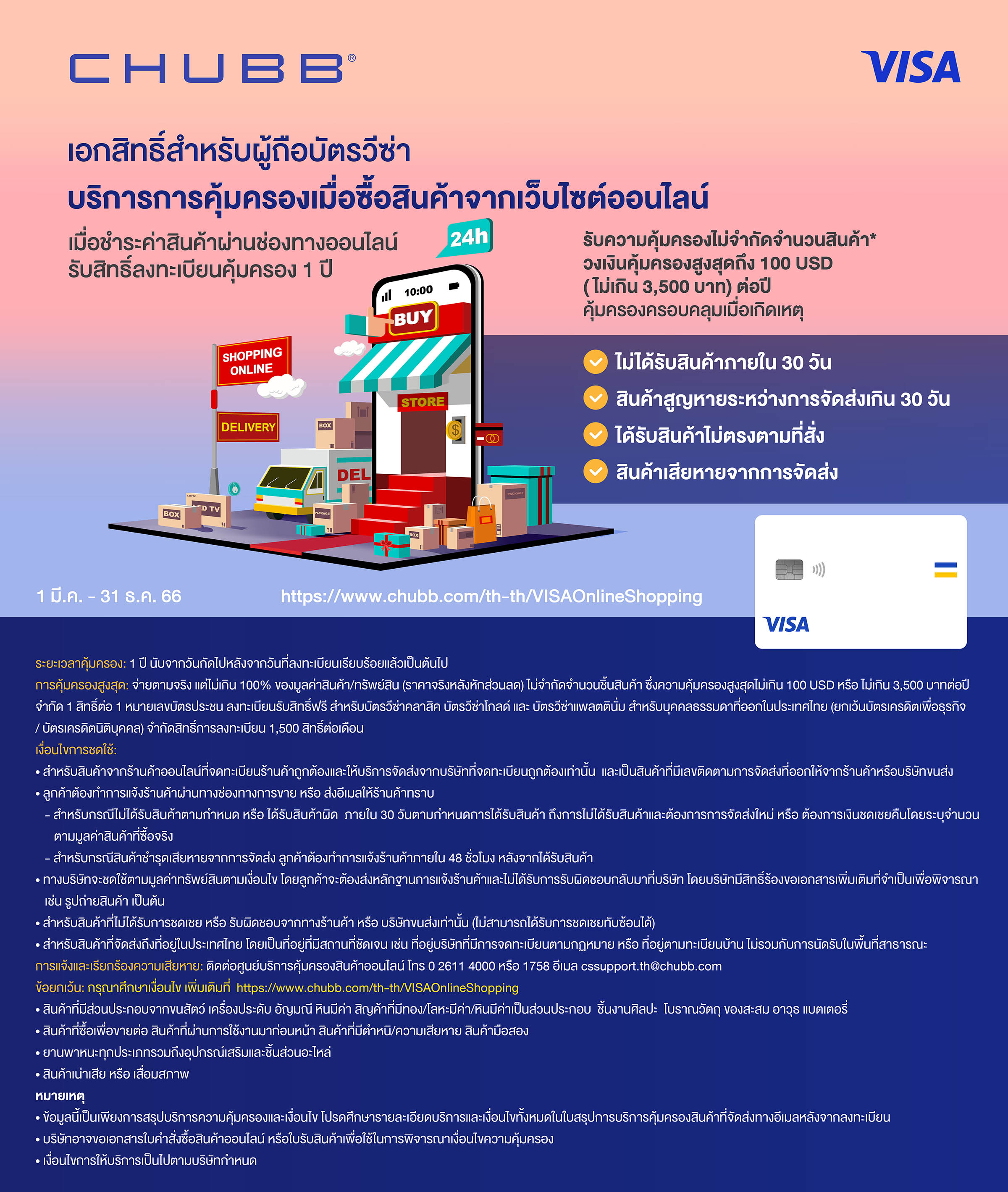 ท่านที่สนใจสมัครรับสิทธิประโยชน์เพิ่มเติมด้านประกันภัยผ่านบัตรเครดิตและบัตรเดบิตวีซ่า กรุณาติดต่อโดยตรงกับทางธนาคารผู้ออกบัตรของท่าน