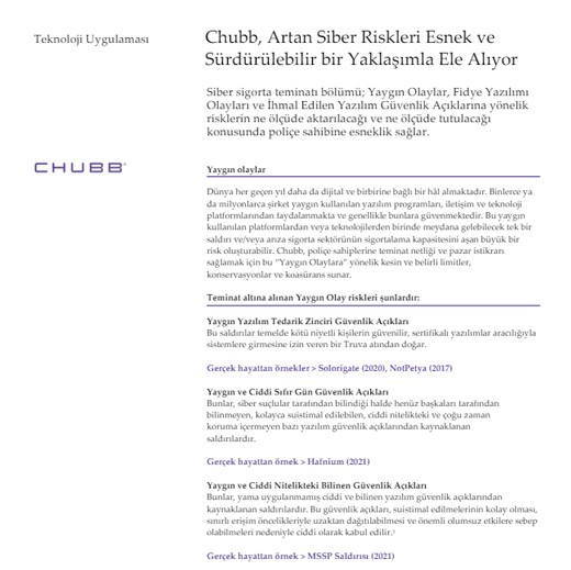 Piyasa istikrarının sağlanmasına yardımcı olmak ve poliçe sahiplerimiz için kapsam netliği sağlamak için Chubb bir siber olayın etkisini ölçmek üzere iki kategori kullanır: Sınırlı Etkiye Sahip Olaylar ve Yaygın Olaylar. Peki bu siber poliçe sahipleri için ne anlama geliyor? Bilgi edinmek için videoyu izleyin!