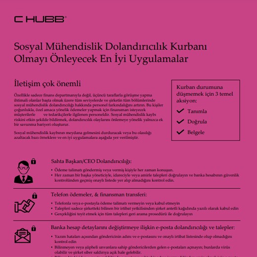 Çalışanların veya üçüncü tarafların işledikleri suçlar nedeniyle oluşan maddi kayba karşı teminat sağlıyoruz. Para, menkul kıymet veya mülkün hileli bir şekilde alınması, ele geçirilmesi veya tahsis edilmesi durumları da buna dahil olabilir. Ayrıca sosyal mühendislik dolandırıcılığına karşı da teminat sağlıyoruz.