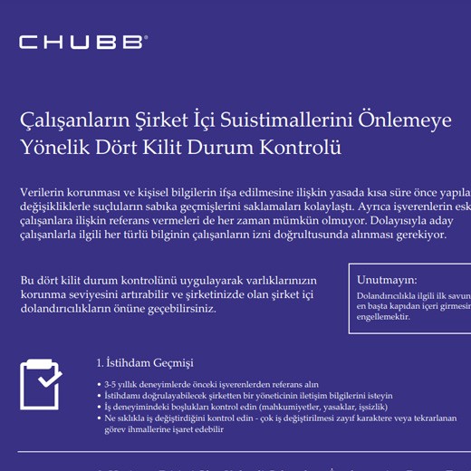 İşletmenizin ölçeğinin büyük veya küçük olmasına ya da dünya genelinde veya sadece yerel olarak faaliyet göstermesine bakmaksızın, Chubb her zaman yanınızda. Emniyeti suistimal sigortası konusundaki deneyimimiz sayesinde, ihtiyaç duyduğunuz her an ve her yerde gerekli yönlendirme ve hizmeti sağlayabiliriz.
