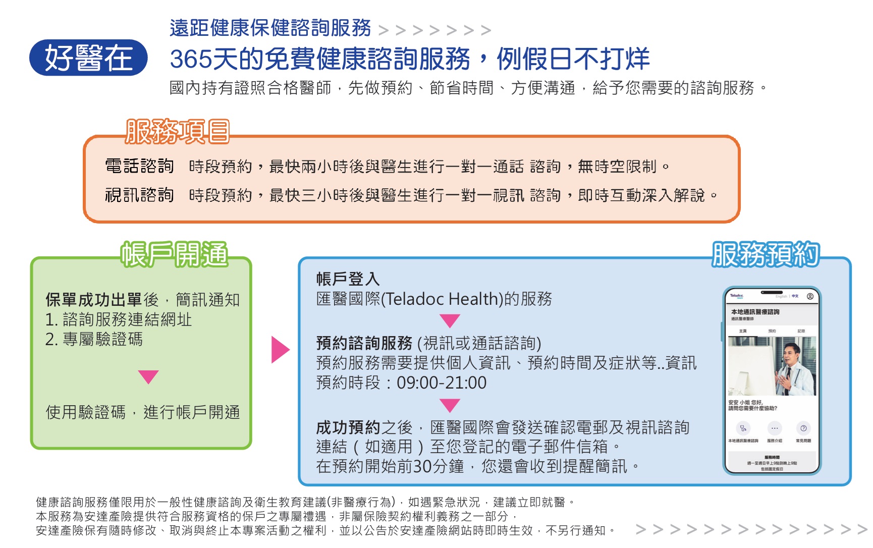 4. 使用者須透過安達產險提供之連結開啟Teladoc平臺後登入/註冊,並使用安達提供的專屬驗證碼綁定身分,始能享有此服務。