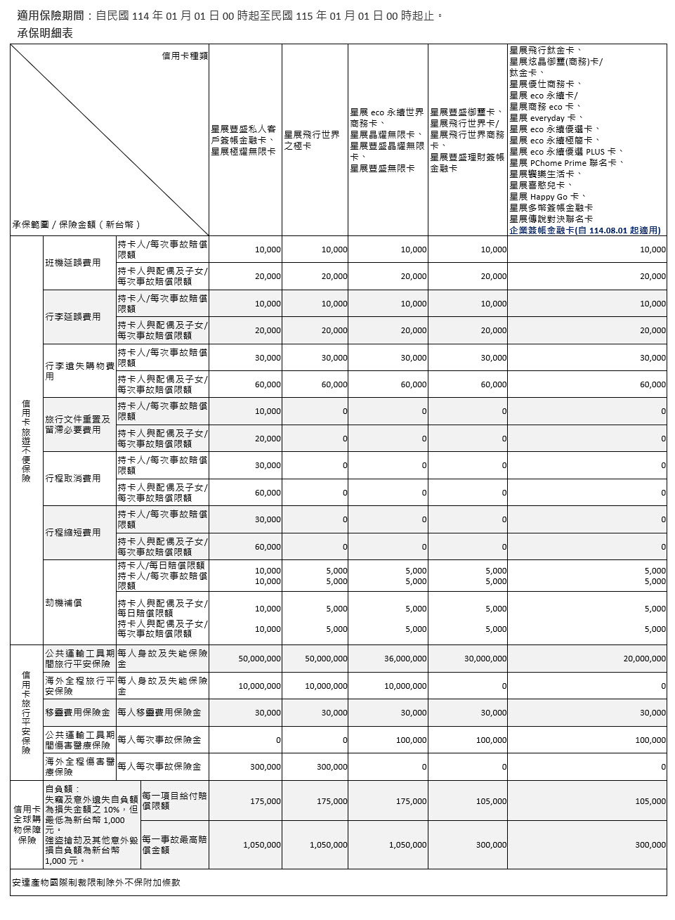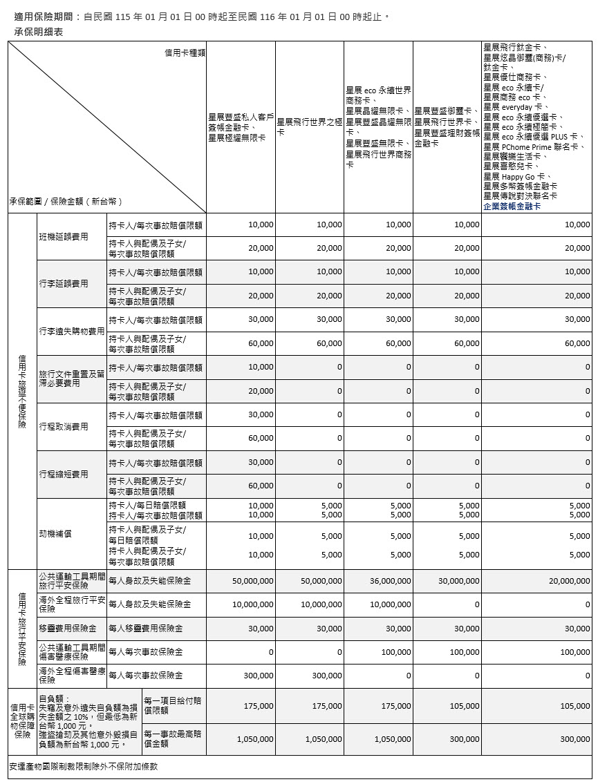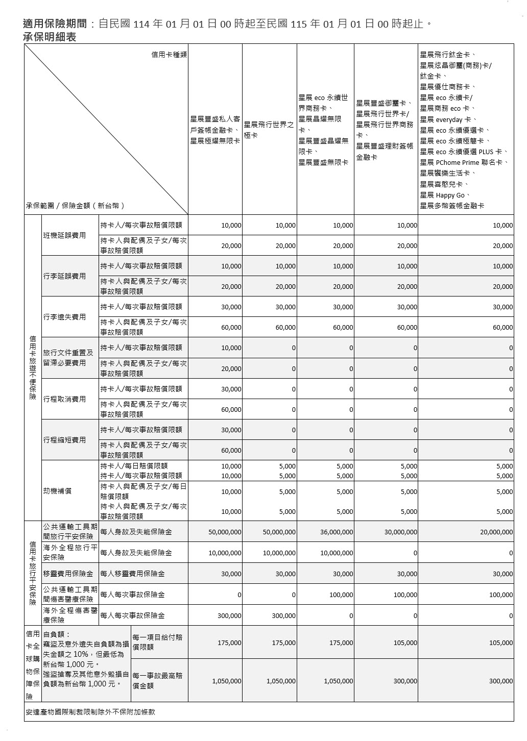 提供持有星展銀行(台灣) 所核發之有效承保信用卡(含正卡及附卡)之持卡人,於保險期間內持有效之承保信用卡支付公共運輸工具全部票款或百分之八十以上之團費,依各卡別享有各卡別所屬之保障。