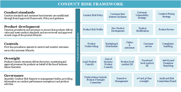Chubb Europe has developed a framework which governs the processes and controls to deliver and assure customer best interests. Control standards and customer outcomes are established through the Conduct Risk Policy, related policies and guidance documents. First line management implements the standards through operational procedures across the customer journey, from product development through to post-sale servicing. The organisation structure includes a Product Council for each line of business and first line management activities are focused on the implementation and delivery of customer best interests through the processes. There are dedicated conduct resources within the first line to support senior management carrying out their responsibilities.