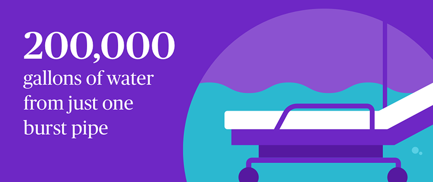 When a pipe burst on the upper floor of a medical building, over 200,000 gallons (757,082 L) of water cascaded onto several floors below. The incident resulted in the transfer of hundreds of patients — including infants — to neighboring hospitals. It took a full year to repair the damage, and led to a loss of over $4 million USD.