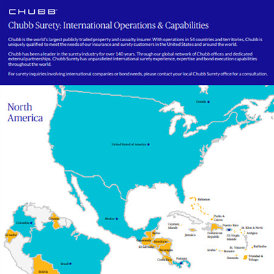 Chubb is a world leader in insurance and surety. With capabilities in 45+ countries and territories and 140 years of surety experience, Chubb is uniquely qualified to meet the needs of our surety customers globally.