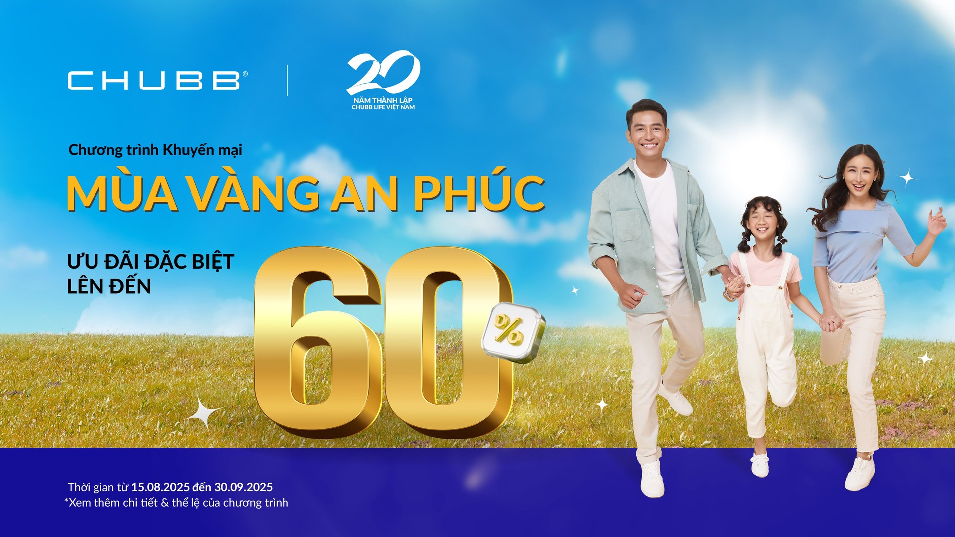 Từ ngày 15/08/2025 đến hết ngày 30/09/2025, Công ty TNHH Bảo hiểm Nhân thọ Chubb Việt Nam (“Chubb Life”) triển khai chương trình khuyến mại “MÙA VÀNG AN PHÚC” (sau đây gọi là “CTKM”) với nhiều hoạt động đa dạng và quà tặng có giá trị gửi đến Quý khách hàng. Thông tin về CTKM như sau:
